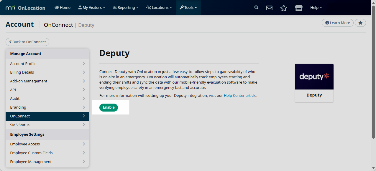 Before importing data and configuring settings, you must first enable the Deputy integration.
