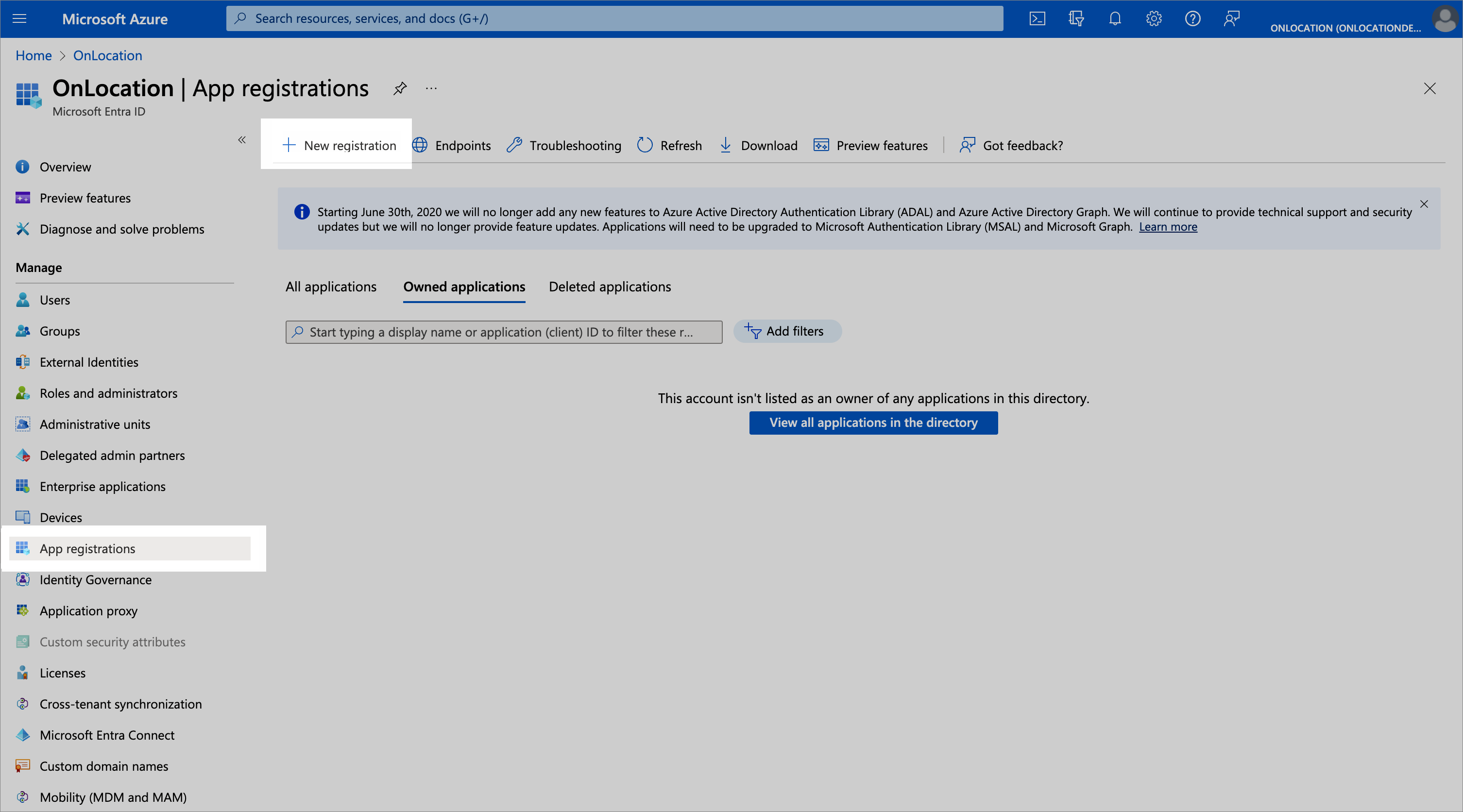 1. In the Azure portal, select Microsoft Entra ID and select App registrations and click on New registration.