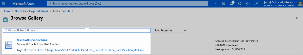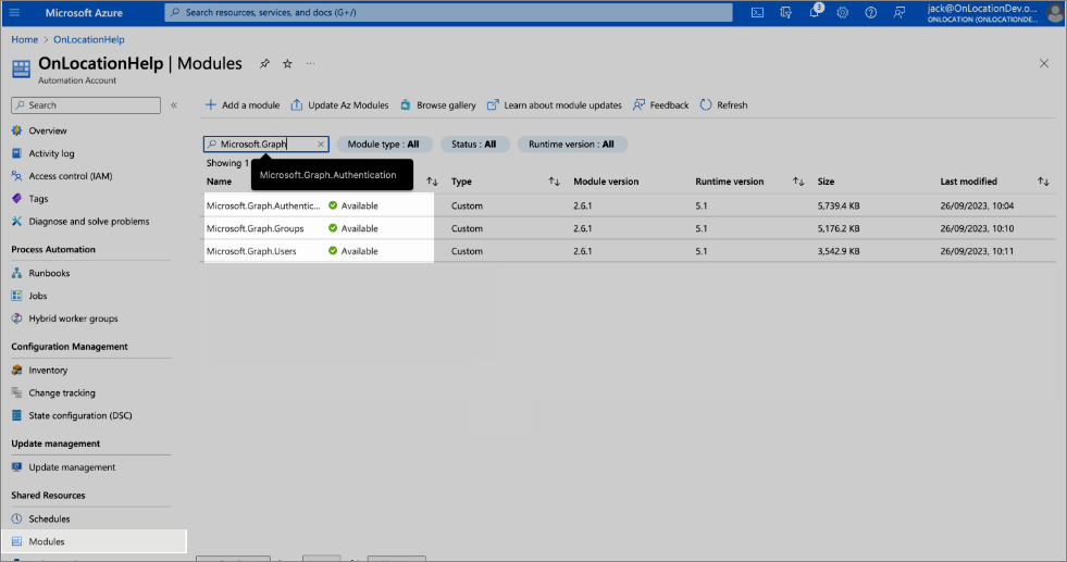 Our runbook requires the Microsoft.Graph.Authentication, Microsoft.Graph.Groups and Microsoft.Graph.Users modules to be installed. This is not set up as a default option and will likely need to be added.