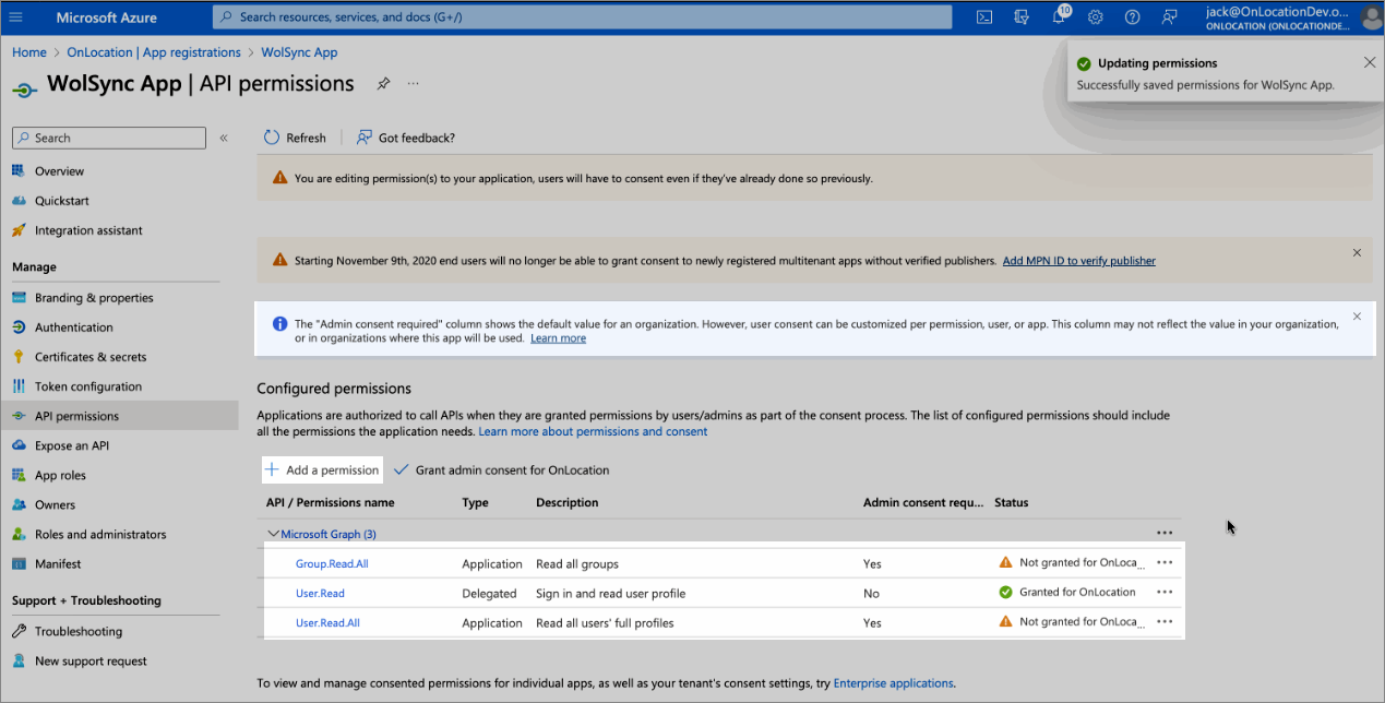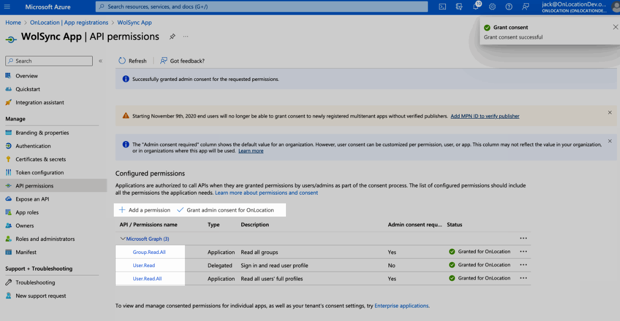 5. Grant admin consent by clicking on Grant admin consent for [your organisation]