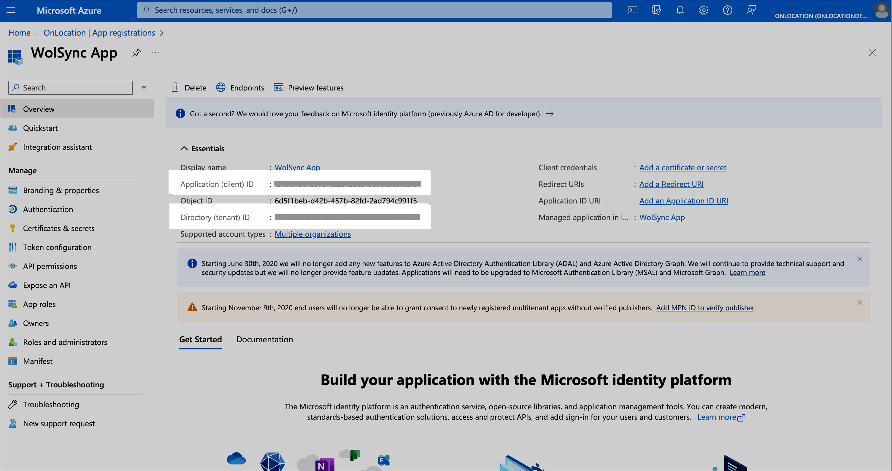 2. From the Overview screen, find the Application (client) ID, which is the WolExportAppClientId