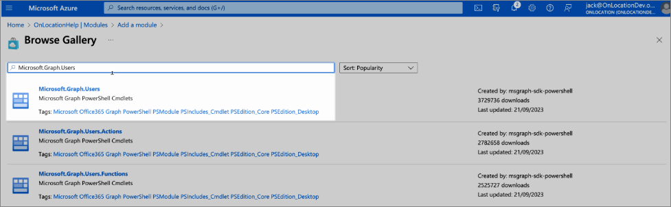 1. From the Automation Overview screen, select the Modules from the menu under Shared Resources. If the module is not present, it can be installed from the Gallery.