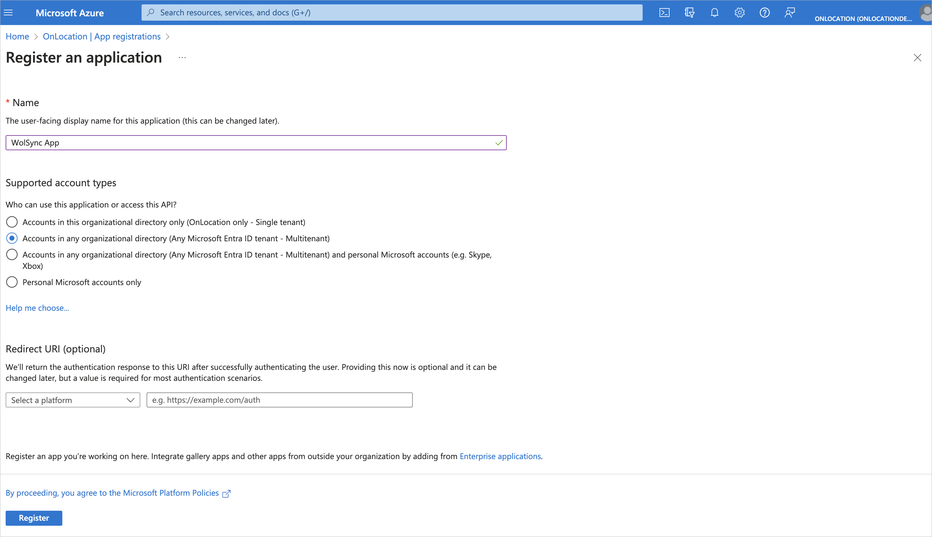 2. On the Register an application page, enter your application's registration information. Select Accounts in any organizational directory option from Supported account types section. Do not set the Redirect URI then click on Register to create the application.
