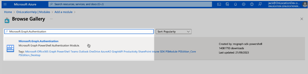 2. Install the Microsoft.Graph.Authentication module and Select Runtime Version 5.1. Click Browse gallery, Search for Microsoft.Graph.Authentication then select the module, Choose the runtime version, then click Import. It takes a while to complete the installation.