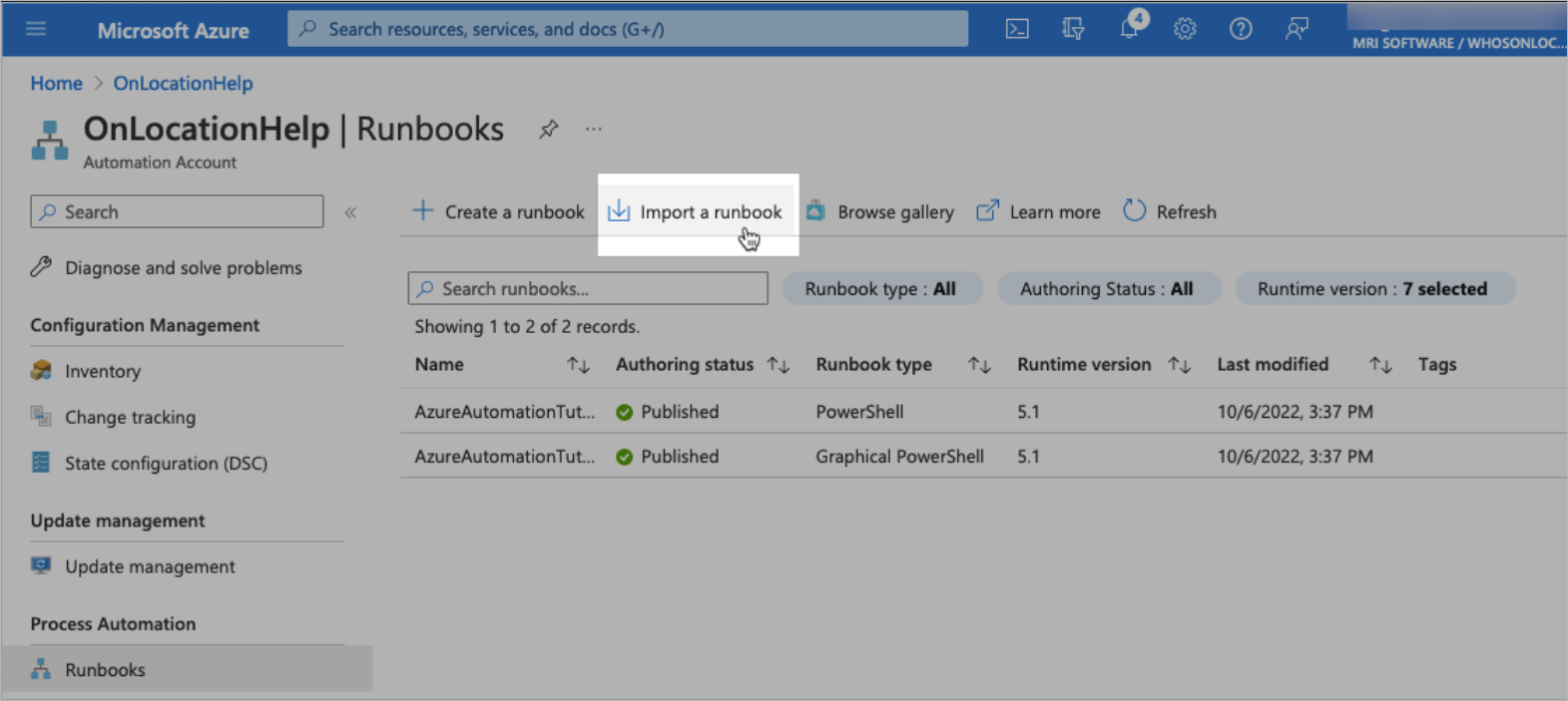 With your credentials set up, you can now import the runbook from OnLocation to your Automation Account resource. This will run the sync when the resource is activated.