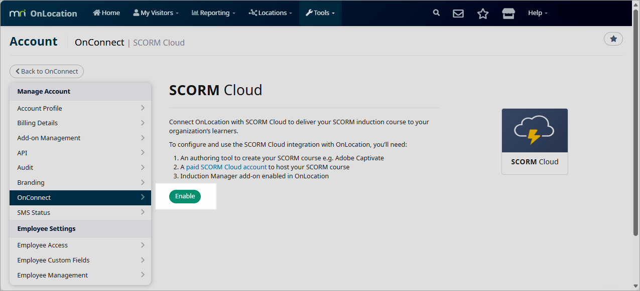 Once your SCORM Cloud account is set up and you’ve uploaded your course, you can access 'OnConnect' in two ways to enable the integration: